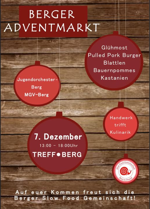 So. 07. Dezember 2025 – Die Berger Slowfood Gemeinschaft lädt ab 13 Uhr zum Adventmarkt (MGV, 15 Uhr).